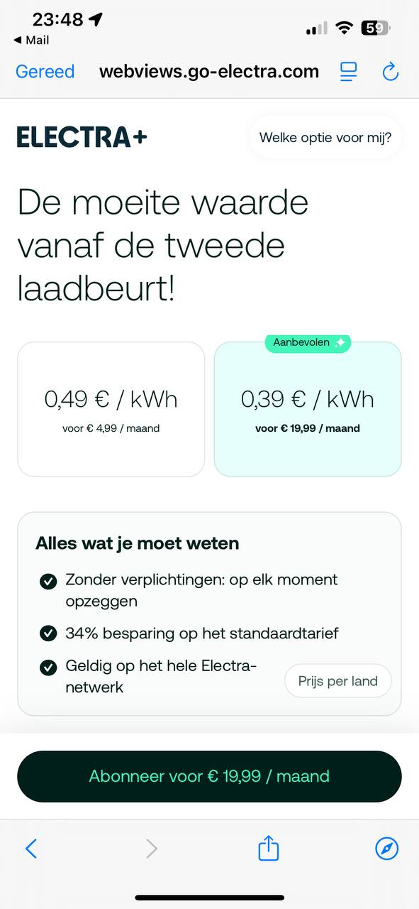 Hun normale tarieven zijn al redelijk scherp, maar met hun Electra+ abonnement gaat hier nog eens 34% vanaf, waardoor je dus in Luxemburg of Frankrijk voor slechts €0,29 per kWh je bolide vol kunt laden. Maar ook snelladen voor 39 cent in België of Italië is aantrekkelijk. Helaas is het aantal locaties in Duitsland nog beperkt.